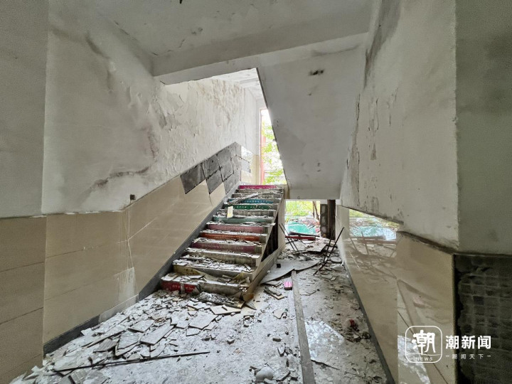 校园里随处可见玻璃碎片、瓷砖碎片和裸露的金属支架,稍有不慎容易划伤。在一幢教学楼里,记者看到楼梯的护栏已被全部拆除,若随意上下楼梯有坠落的风险。