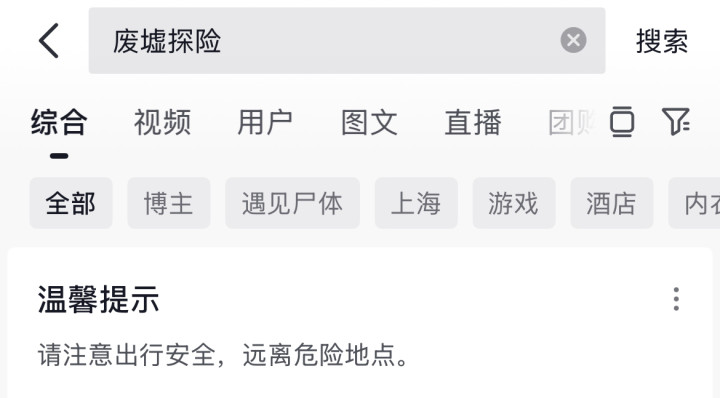 记者在多个社交平台的搜索框内输入关键词“废墟探险”“废弃医院”等均弹出了安全提醒。